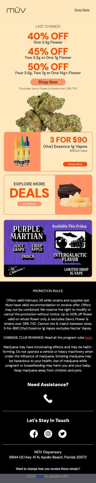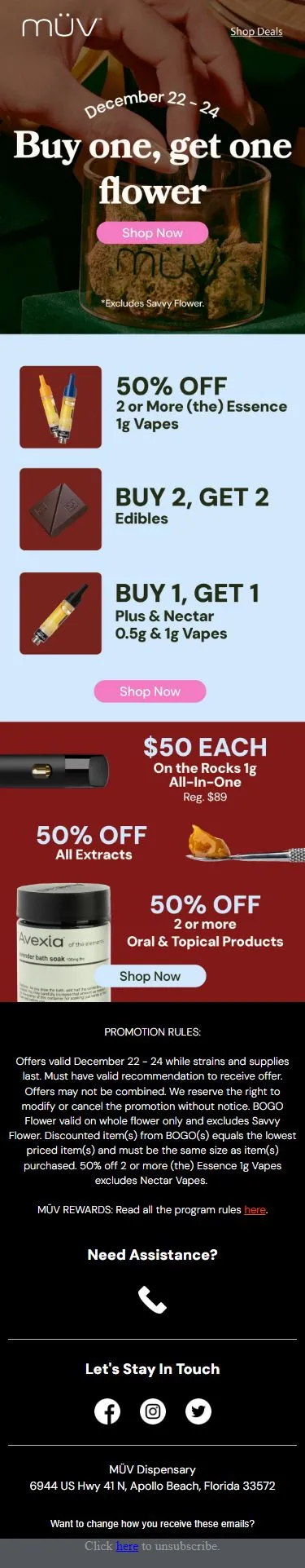 First Visit: 60% OFF + $5 Rewards Bonus After First Purchase Must have valid recommendation to receive offer. May not be combined with other offers. We reserve the right to modify or cancel the promotion without notice. Excludes Dr. Dabber and Puffco Products. Free item(s) from BOGOs must be the same size and product category and of equal or lesser value. Our system will track your purchases and apply the appropriate offer. Once eligible, the second- and third visit discounts must be used within 30 days respectively. Must be a MÜV Rewards member to receive $5 off bonus Rewards credits.