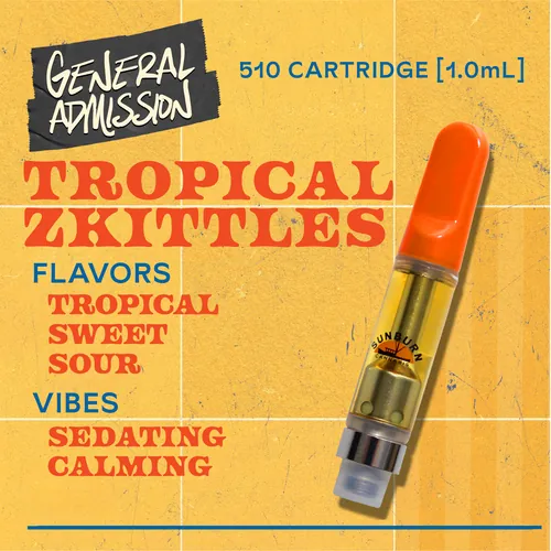 Tropical Zkittlez Indica Vape from Sunburn is available across Florida dispensaries. Check today’s price, potency, and participating locations—updated daily. When a discount is active, you’ll see the savings and can shop directly from the dispensary’s website with one tap. This product is 1.0 grams. Compare sizes and explore the same strain in vape or edible formats when available. Prefer shopping nearby? Use the links below to browse Florida dispensary deals and see the closest stores carrying Tropical Zkittlez - 1g Distillate Vape Carts.